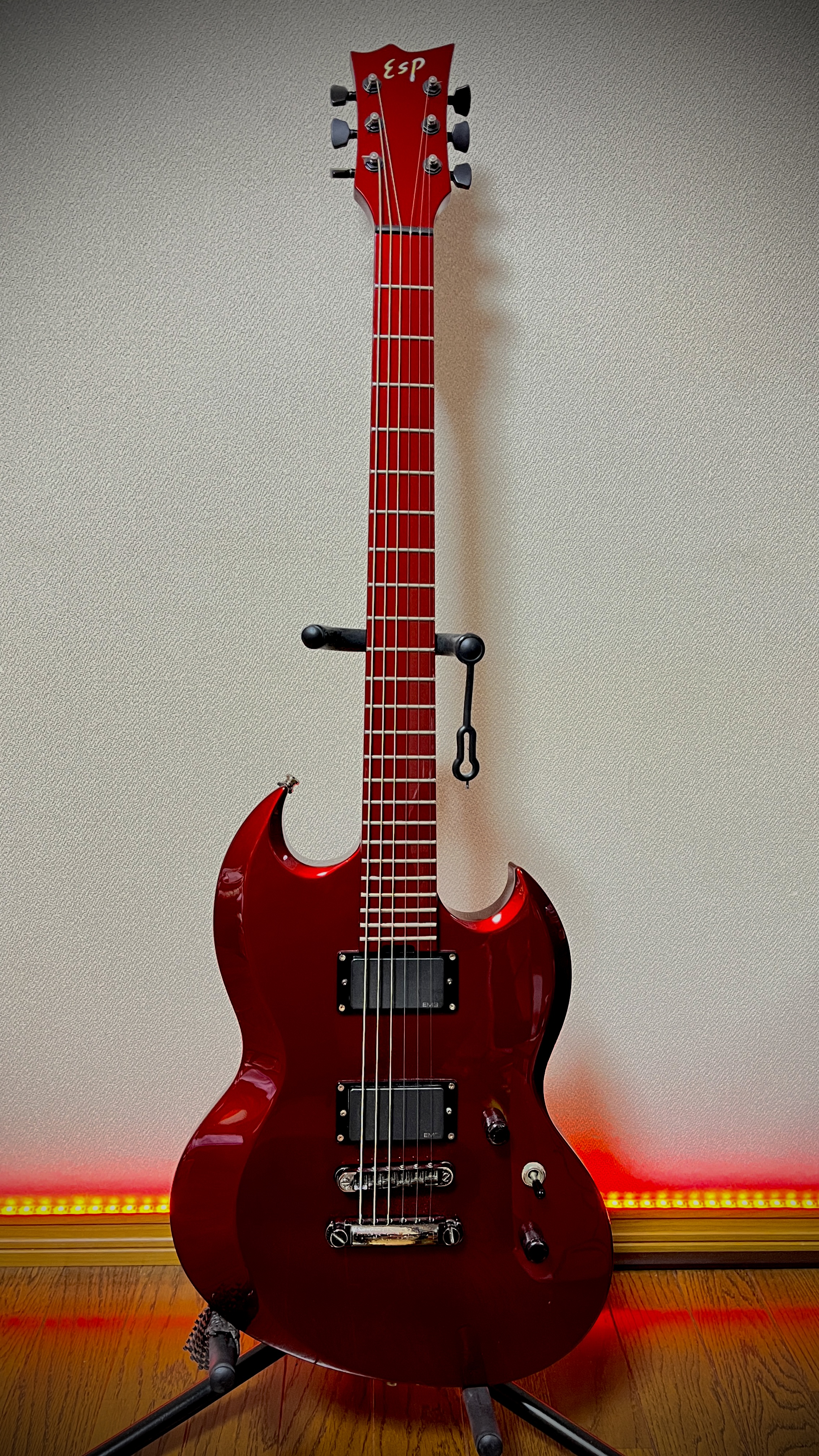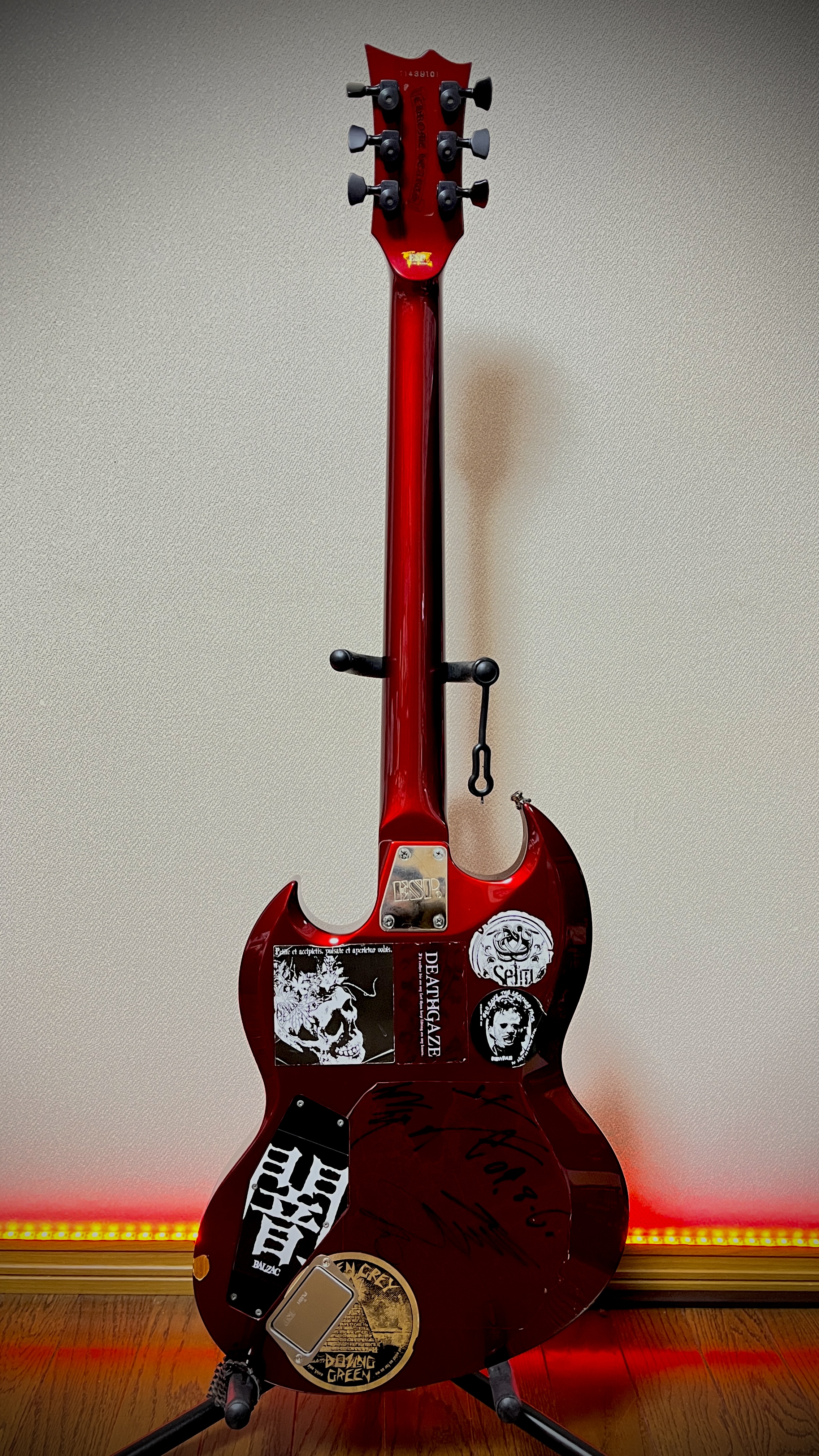 現在は8弦ギター使用につき、こちらは待機中ですが、所有ギターの中で1番の「愛機」です。 「赤好き」な自分の欲求を、全て注ぎました! ボディ裏には、インディーズ時代の「lynch.」メンバーに書いていただいたサインも。